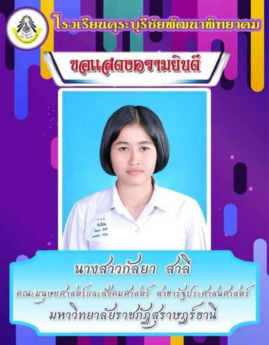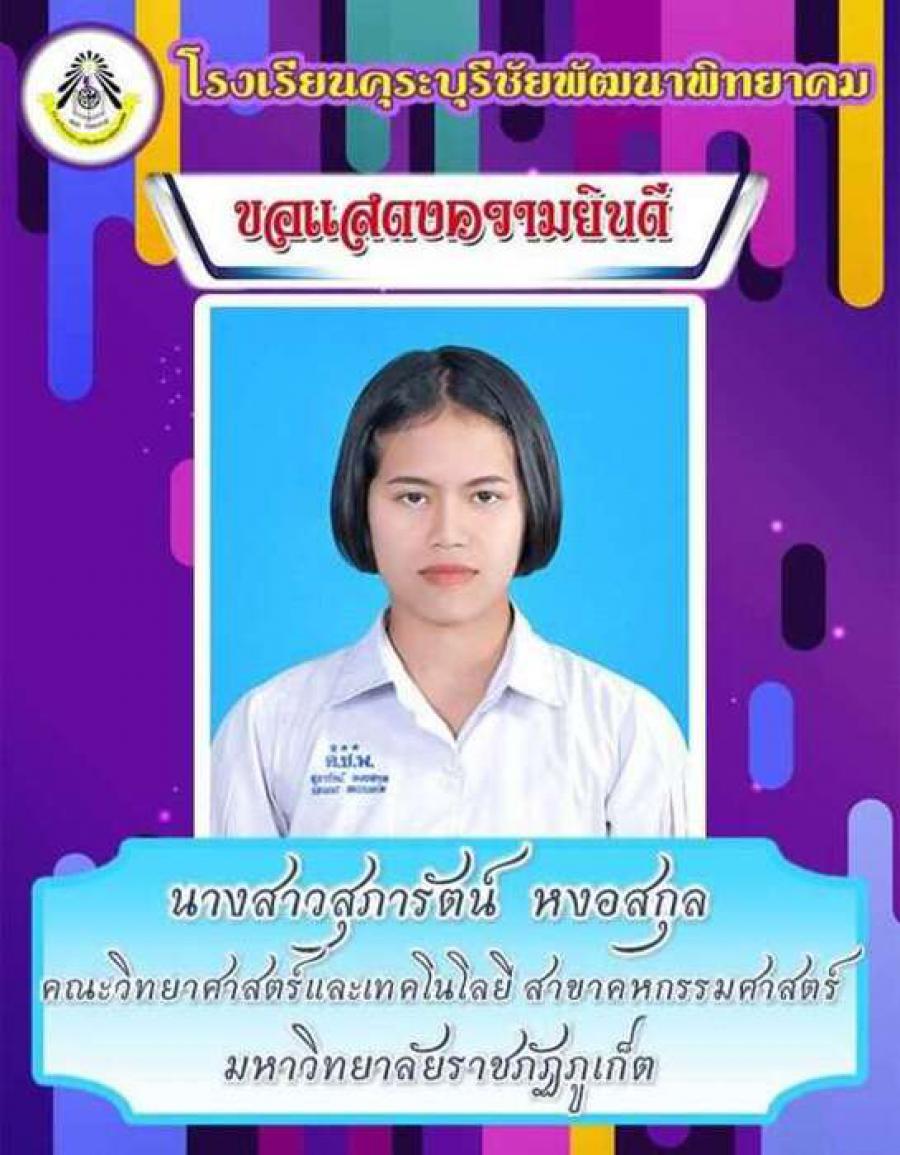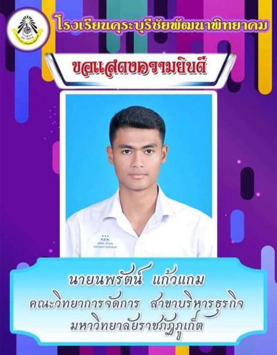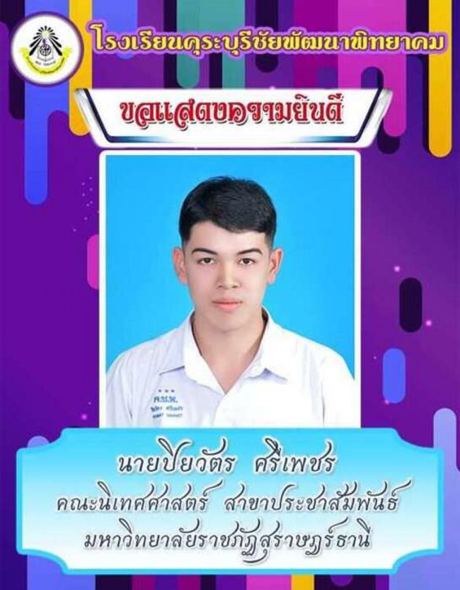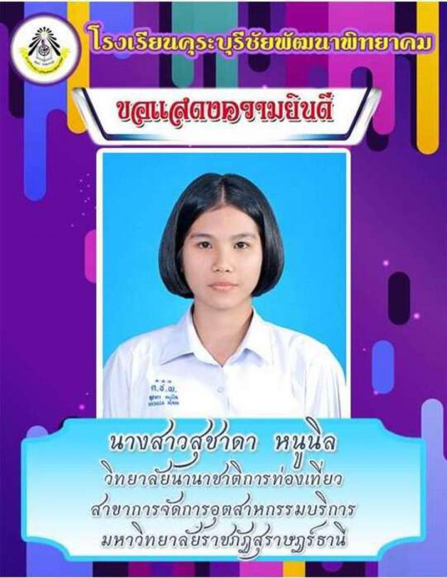 โรงเรียนคุระบุรีชัยพัฒนาพิทยาคม ขอแสดงความยินดีกับนักเรียนชั้นมัธยมศึกษาปีที่ 6 ปีการศึกษา 2562 ที่ผ่านการคัดเลือกเข้าศึกษาต่อในสถาบันอุดมศึกษาต่าง ๆ และขอเป็นกำลังใจให้กับนักเรียนที่ยังรอในรอบต่อ ๆ ไปทุกคน S:0