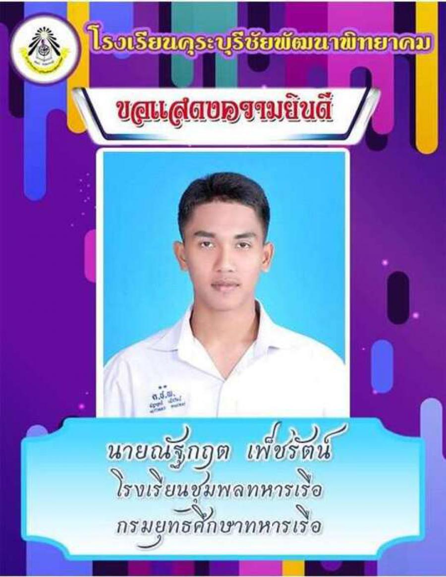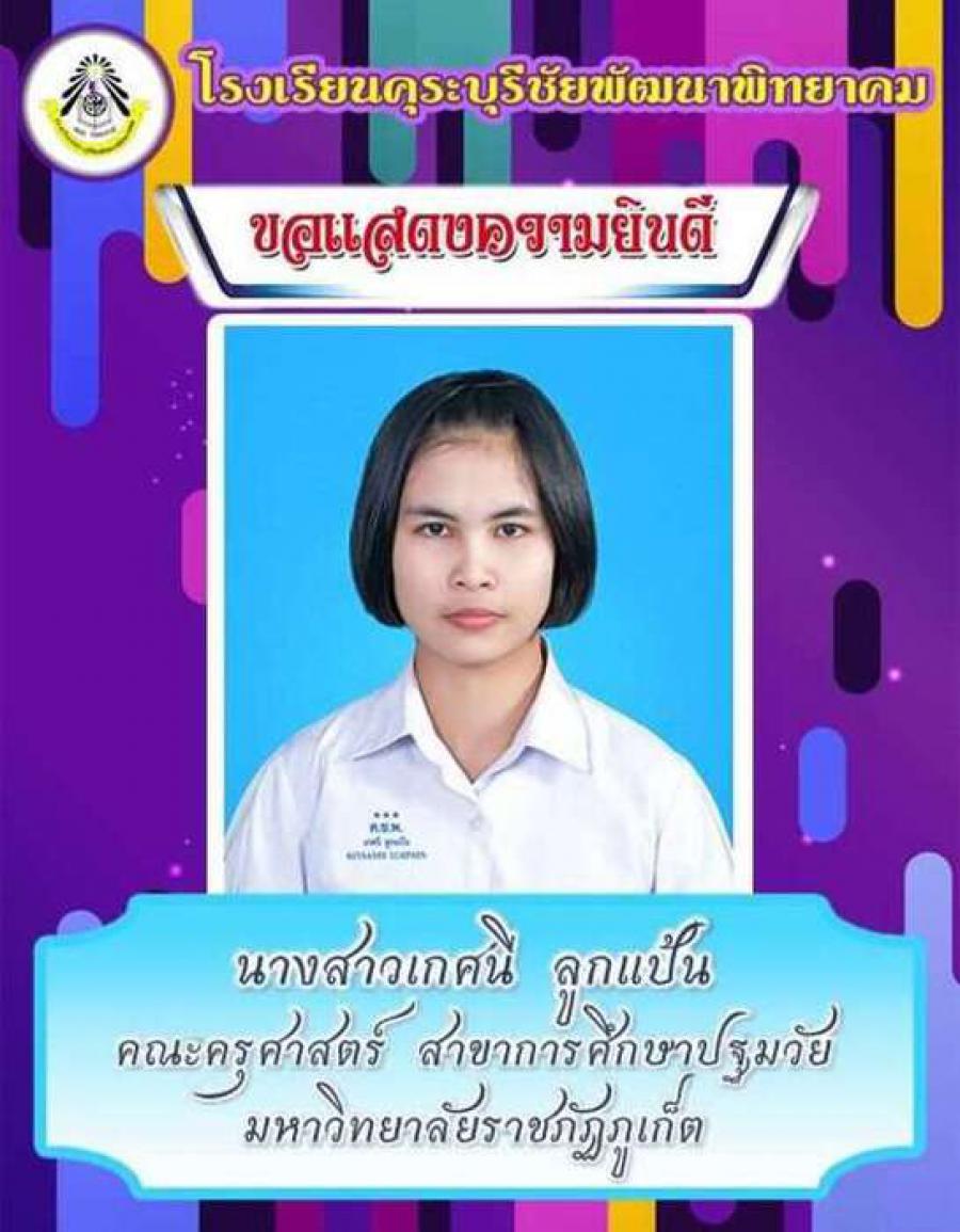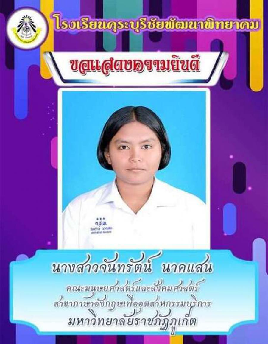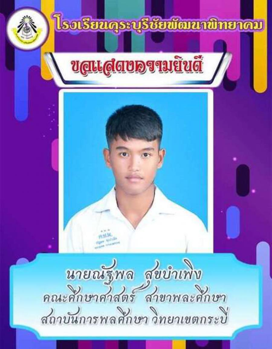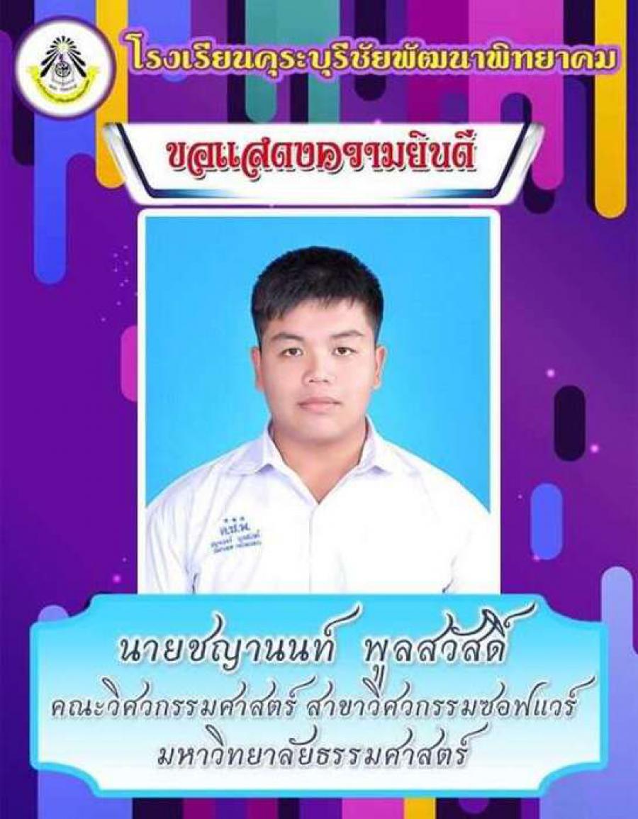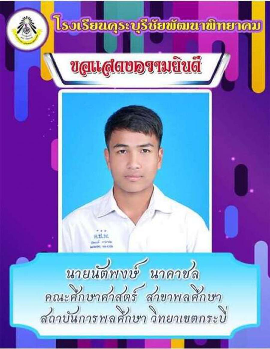 โรงเรียนคุระบุรีชัยพัฒนาพิทยาคม ขอแสดงความยินดีกับนักเรียนชั้นมัธยมศึกษาปีที่ 6 ปีการศึกษา 2562 ที่ผ่านการคัดเลือกเข้าศึกษาต่อในสถาบันอุดมศึกษาต่าง ๆ และขอเป็นกำลังใจให้กับนักเรียนที่ยังรอในรอบต่อ ๆ ไปทุกคน S:0