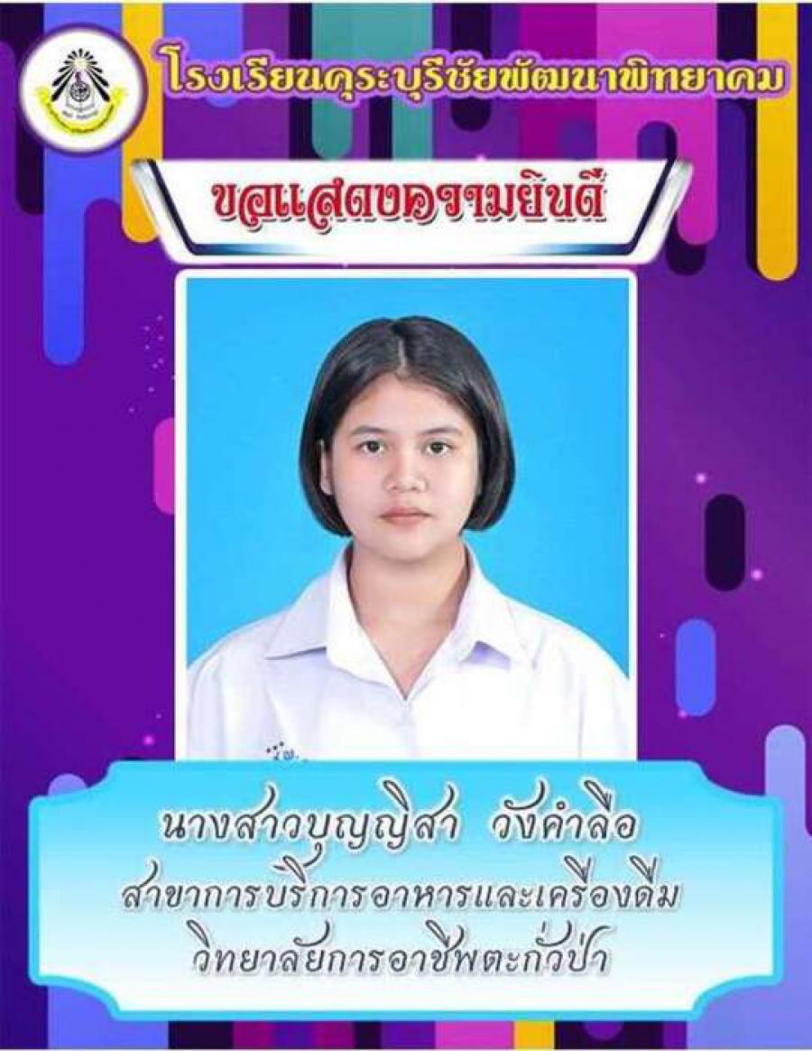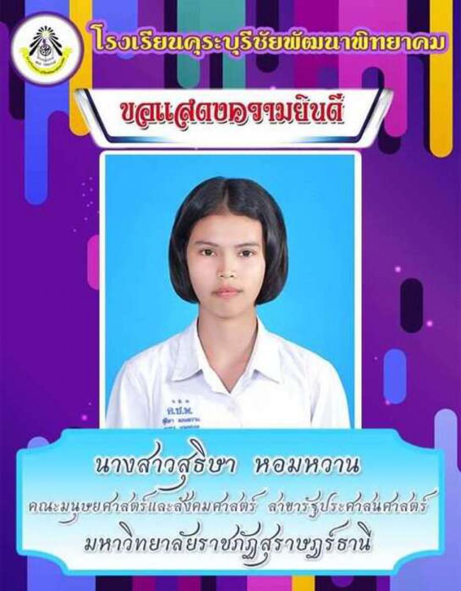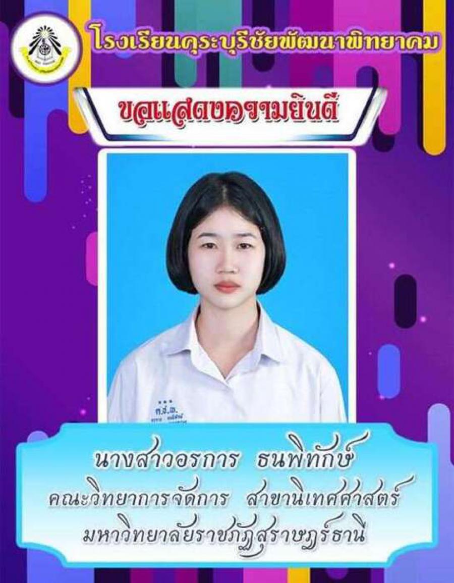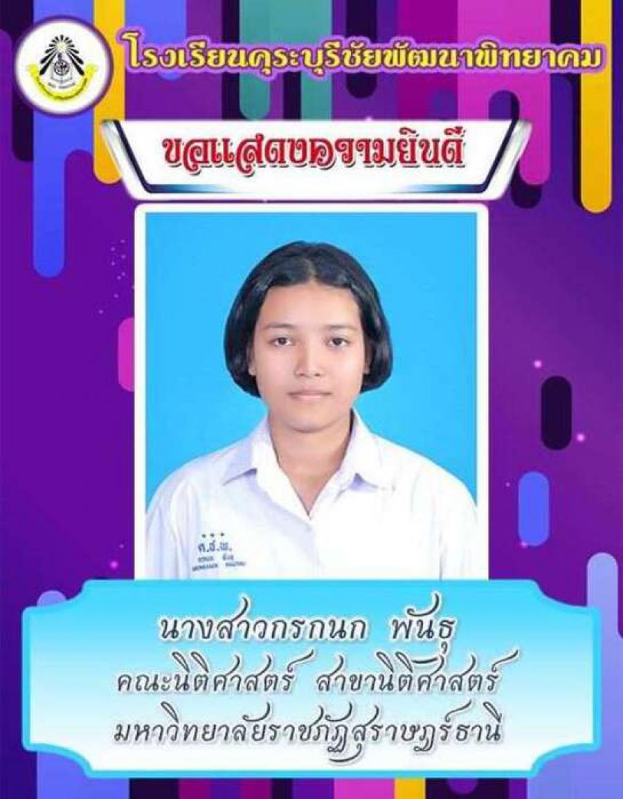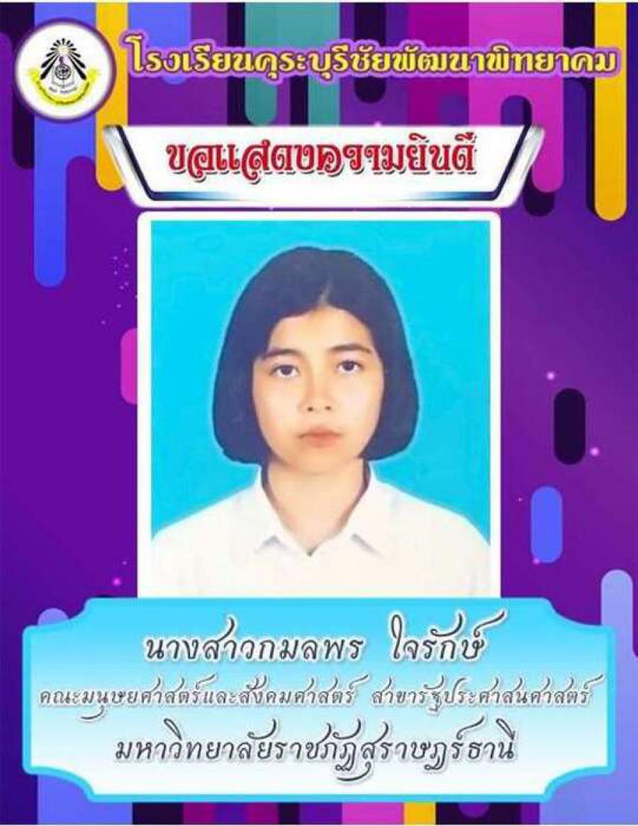 โรงเรียนคุระบุรีชัยพัฒนาพิทยาคม ขอแสดงความยินดีกับนักเรียนชั้นมัธยมศึกษาปีที่ 6 ปีการศึกษา 2562 ที่ผ่านการคัดเลือกเข้าศึกษาต่อในสถาบันอุดมศึกษาต่าง ๆ และขอเป็นกำลังใจให้กับนักเรียนที่ยังรอในรอบต่อ ๆ ไปทุกคน S:0
